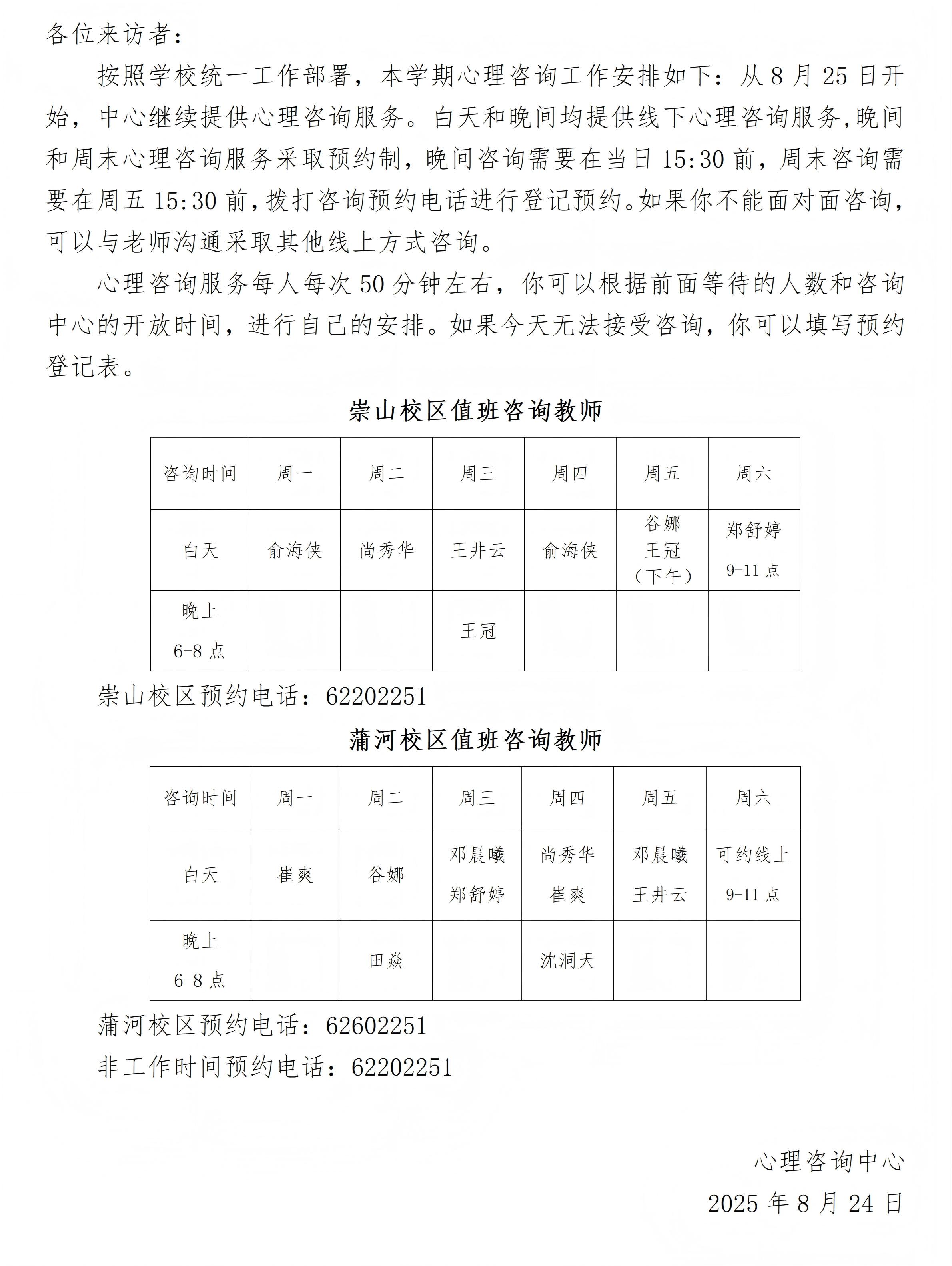 2025秋季心理咨询排班表